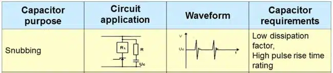 Capacitors used in snubber circuits are subjected to high dV/dt and extremely high values of peak and rms current. These circuits demand capacitors that can withstand current spikes with high peak and rms values. The characteristics of polypropylene film capacitors make them suitable for snubber applications.