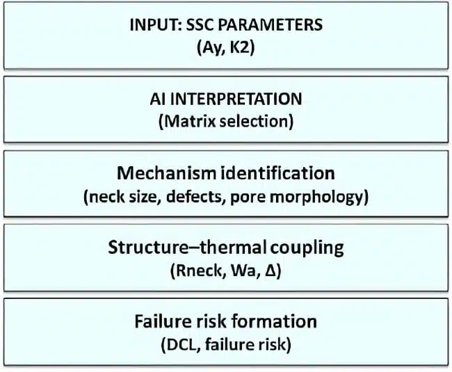 The scheme illustrates the sequential interpretation process, where SSC parameters (Ay, K2) are used as input to an AI-based matrix selection system, enabling identification of dominant structural mechanisms (neck geometry, defects, pore morphology). The resulting structural interpretation is further linked to thermal response (Rneck, Wa, Δ) and ultimately to reliability, expressed through DCL behavior.