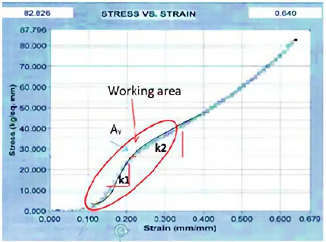 Fig. 1. Stress–strain curve of a sintered tantalum pellet illustrating the definition of SSC parameters (Ay, k1, K2) used for structural diagnostics. The highlighted region corresponds to the working deformation range.