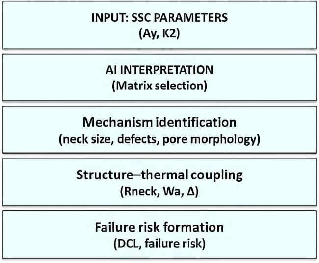 The scheme illustrates the sequential interpretation process, where SSC parameters (Ay, K2) are used as input to an AI-based matrix selection system, enabling identification of dominant structural mechanisms (neck geometry, defects, pore morphology). The resulting structural interpretation is further linked to thermal response (Rneck, Wa, Δ) and ultimately to reliability, expressed through DCL behavior.