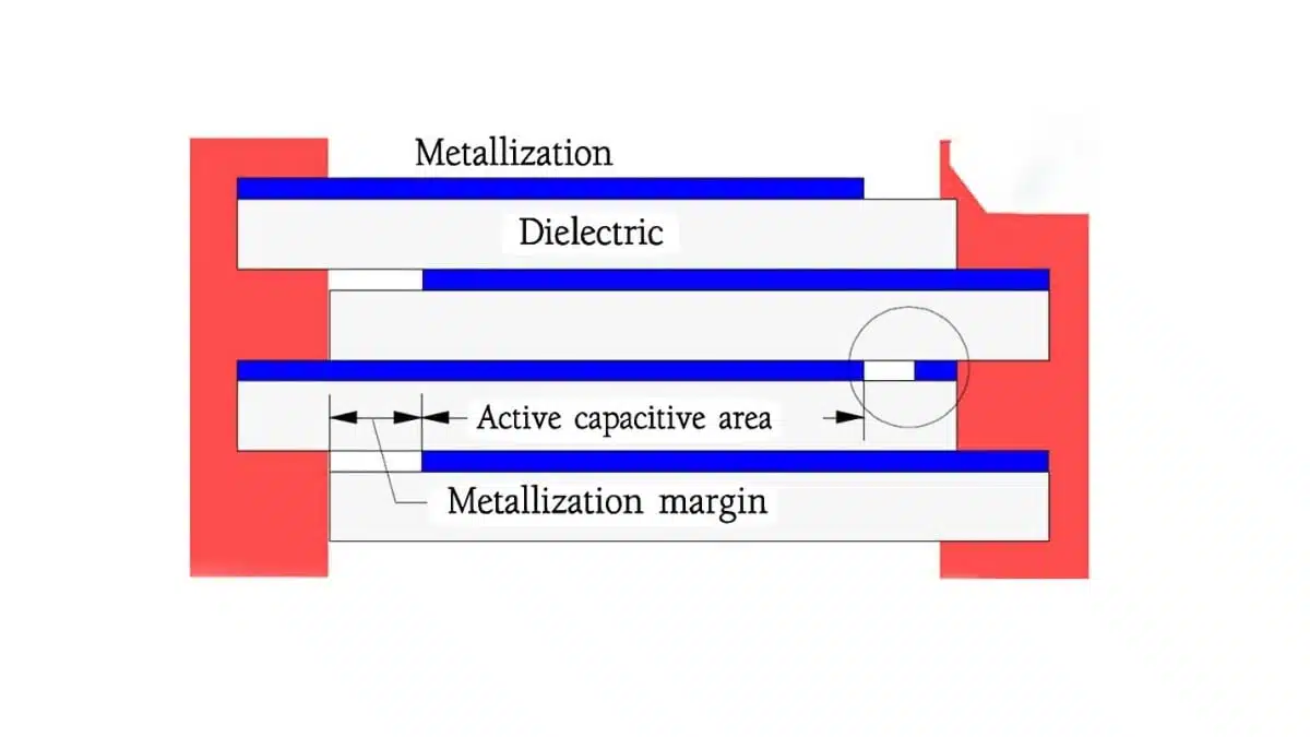 The metallized layer is connected to the terminals by means of a sprayed metal compound applied on the winding or stack ends. The process sometimes is called schooping.  By shifting the foils alternately and terminating their metallization a little bit from the edge a short circuiting to the opposite terminal is prevented (Figure 6). The figure also shows the active capacitive area which for obvious reasons is maximized. It is done at the expense of the metallizing margins. The balance between security against short circuit and as small margins as possible requires great skillfulness and manufacturing accuracy. Margins of  0.2…0.3 mm (8…12 mils) are regarded as risky with respect to the IR quality while a margin of 1 mm (40 mils) eliminates these risks. Some manufacturers metallize the whole width of the foil and make a laser cut along one edge – encircled area in Figure C6 – and achieve in this way a more controlled metallizing margin simultaneously as they obstruct forbidden penetration of the end spray metal. Note however that the figure following, for reasons of emphasis, is far from being to scale.