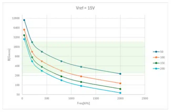 To better understand, we calculate working point based (flux density B) according to Eq.5 based on our automotive application conditions: Freq. = 200kHz, Vref=15V, DutyCycle=0.8. This equation is also specified in datasheet (Fig. 9, Notes, Pkt 4). Calculations can be systemized as in Table 2: