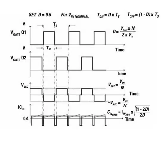 - The topology features two switches and a center-tapped transformer, generating alternating square waveforms with voltage stress on the MOSFETs.