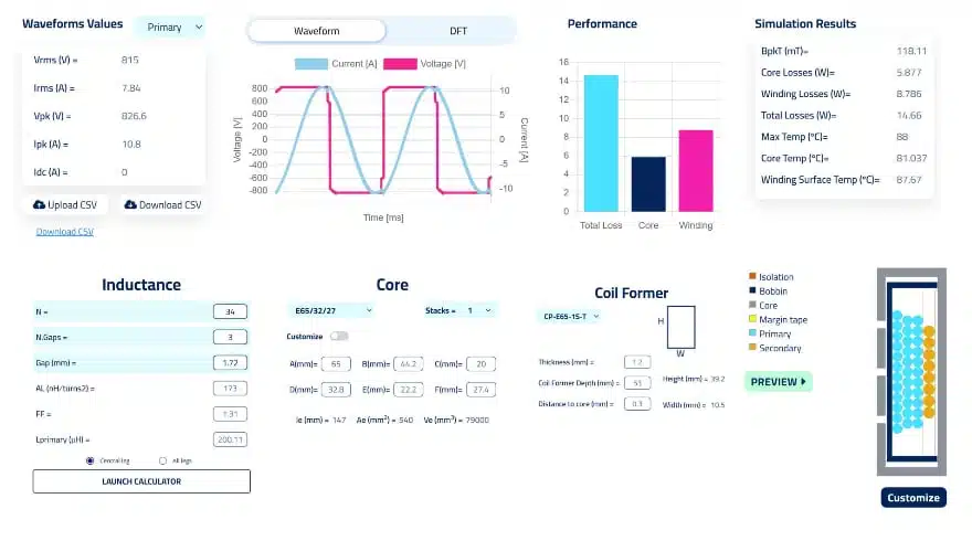 Load the candidate cores, turns, and into a tool such as Frenetic, then iterate across winding arrangements, gaps and wire options while monitoring achieved inductances, core and copper losses and hotโspot temperature for each configuration.