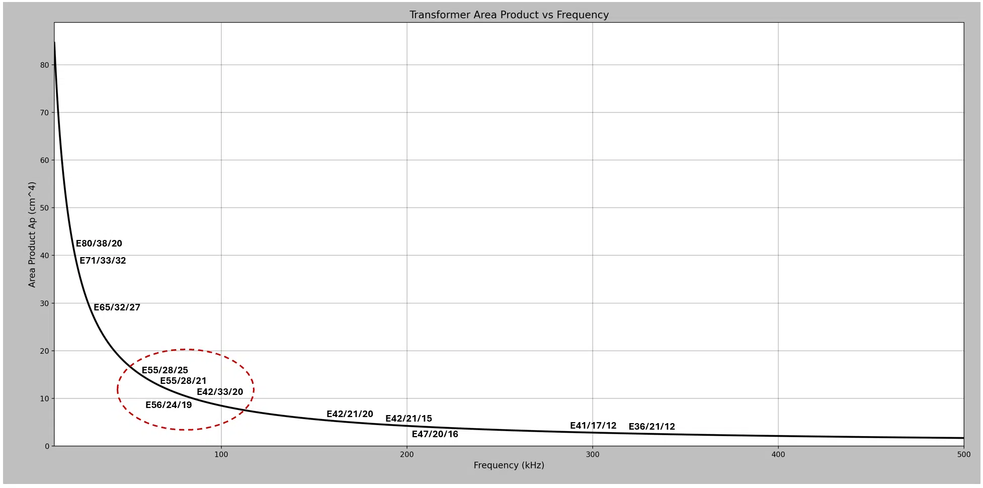 With these assumptions, the estimated area product is on the order of 8 cm4. This points toward mediumโtoโlarge Eโcores as suitable candidates, such as: