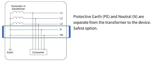 | TN‑S | T: neutral directly earthed at source | N: exposed parts bonded to dedicated PE from source | Neutral and PE separate from transformer to all loads (S throughout) | Industrial plants, data centres, hospitals and critical facilities | No PEN conductor; dedicated low‑impedance PE path; fast and reliable protection; good EMC performance | Higher installation cost due to additional PE conductors over full distance from transformer |