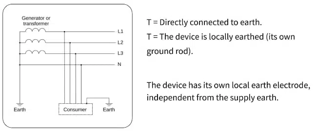 - T (terra) for the first letter indicates a directly earthed source neutral, while I indicates an isolated or impedance‑earthed source.