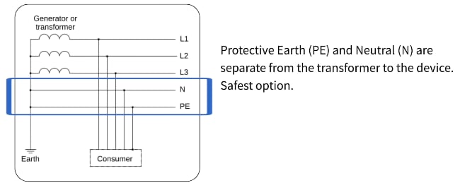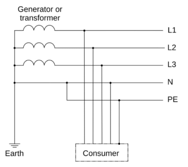 Typical applications include large industrial plants, data centres and hospitals, where high levels of safety, reliability and electromagnetic compatibility are required. From the transformer secondary winding, one conductor is designated neutral, and a completely independent protective earth conductor runs parallel, bonded to all exposed conductive parts and to the source earth.