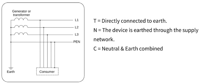 The IEC 60364 letters describe the earthing arrangement. The first letter shows the source earthing: T (terra) means the source neutral is directly earthed, I means the source is isolated or impedance-earthed. The second letter shows how exposed parts are earthed: T means they are connected to a local earth electrode, N means they are connected via a protective conductor to the supply neutral. Additional letters C and S indicate whether neutral and protective earth are combined (C, PEN conductor) or separate (S, distinct N and PE conductors).