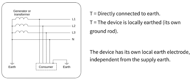 - TT – direct connection of the source neutral to earth, exposed conductive parts are connected to a local earth electrode (local earth pit)