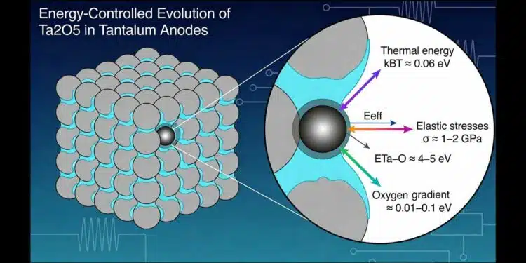 Internal elastic stresses of approximately 1–2 GPa in the interface zone correspond to atomic-scale energies of ~0.02–0.05 eV. These stresses are determined by technological parameters such as powder morphology, sintering conditions, formation voltage, and annealing atmosphere. While they do not rupture Ta–O bonds, they modify the local energetic landscape, influencing diffusion barriers, coordination stability, and relaxation pathways. From an engineering standpoint, internal stresses represent a controllable energetic parameter linking process conditions to material behavior.