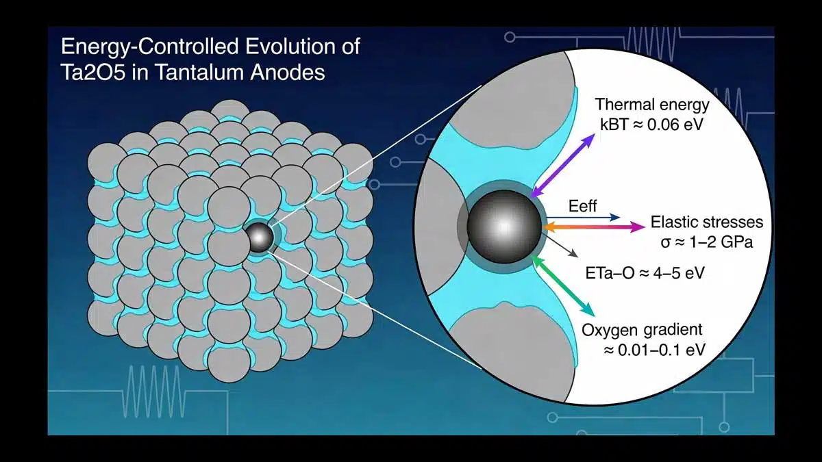 Internal elastic stresses of approximately 1–2 GPa in the interface zone correspond to atomic-scale energies of ~0.02–0.05 eV. These stresses are determined by technological parameters such as powder morphology, sintering conditions, formation voltage, and annealing atmosphere. While they do not rupture Ta–O bonds, they modify the local energetic landscape, influencing diffusion barriers, coordination stability, and relaxation pathways. From an engineering standpoint, internal stresses represent a controllable energetic parameter linking process conditions to material behavior.