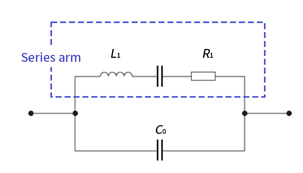 The motional elements L1L_{1}, C1C_{1} and R1R_{1} are connected in series, and this series branch is placed in parallel with the shunt capacitance C0C_{0}.