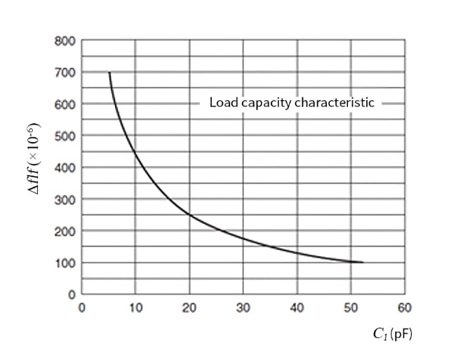 When a load capacitance CLC_{L} is connected in the oscillator circuit, the oscillation frequency fLf_{L} shifts from the series resonance. The load resonant frequency is expressed by:fL=fs(C12 (C0+CL)+1)f_{L} = f_{s} \left( \frac{C_{1}}{2\,(C_{0} + C_{L})} + 1 \right)