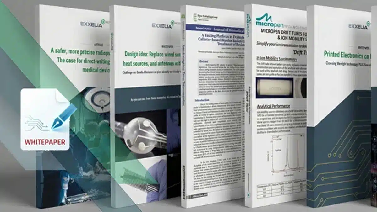 The new Micropen white papers are available through the Exxelia Technical Center under the Micropen‑related guides and technical documents section. From the overview page, engineers can navigate directly to individual titles such as printed electronics on medical devices, radiopaque markers, drift tubes for mass spectrometry and the design idea paper on replacing wired components with direct‑printed structures.