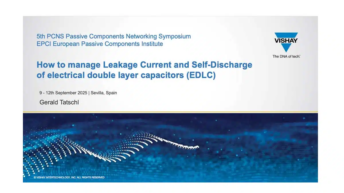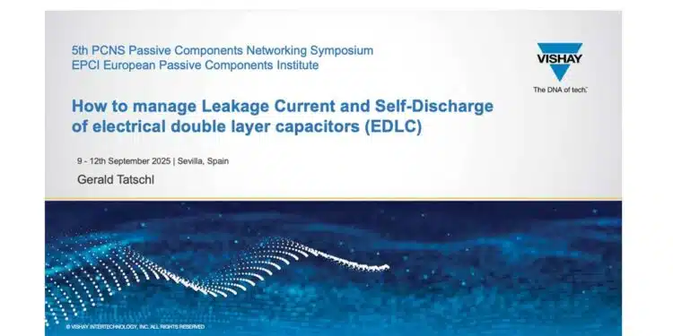 The paper “How to Manage Leakage Current and Self Discharge of EDLC Capacitors” was presented by Gerald Tatschl, Vishay BCcomponents, Klagenfurt am Wörthersee, Austria at the 5th PCNS Passive Components Networking Symposium 9-12th September 2025, Seville, Spain as paper No. 6.3.