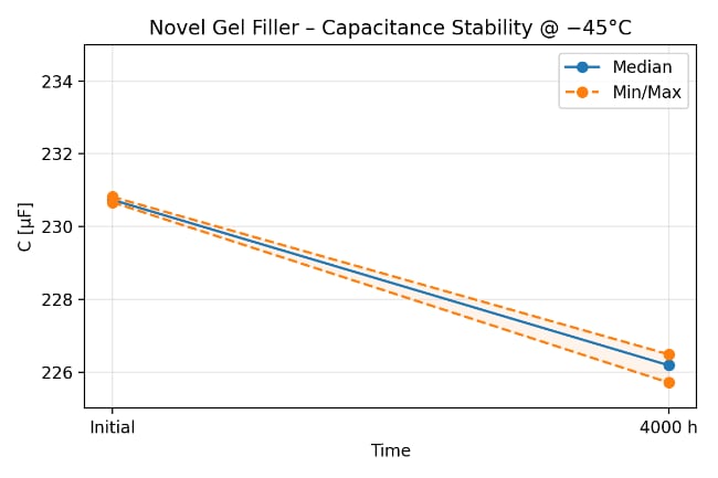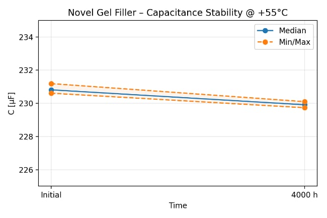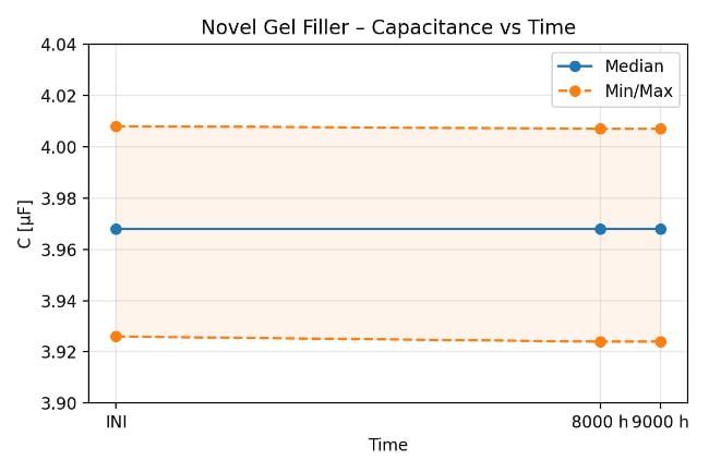 The new filler results are quite impressive compared to traditional oil filling. Capacitors filled with Hydra gel show similar or even lower dissipation factor values after thousands of hours of testing at 85C life test (see the results below). This indicates that the insulation properties of the gel filler remain stable even after accelerated lifetime testing and exceeds capabilities of the conventional filler material.
