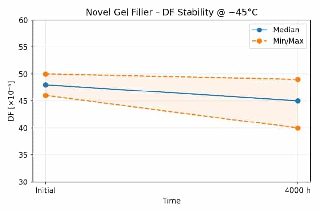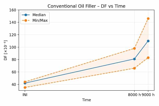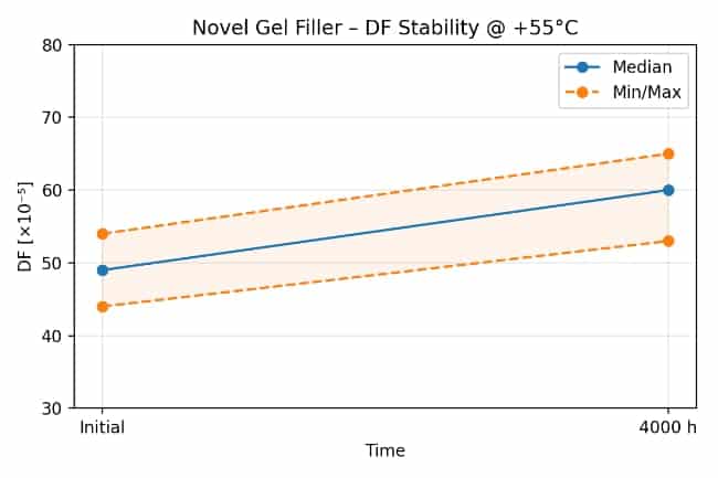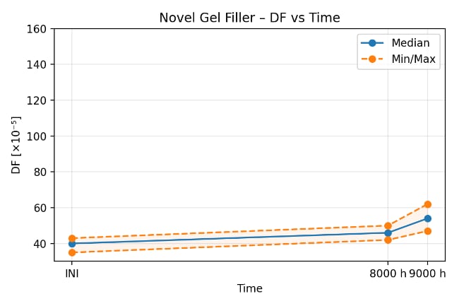 In long-term tests on Hydra power factor correction capacitors with gel filling, dissipation factor values after thousands of hours of accelerated life tests remain similar or lower than for comparable oil-filled units. This indicates stable dielectric behavior and good insulation properties over time under thermal and electrical stress, according to the manufacturer’s test data.