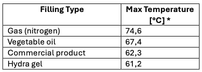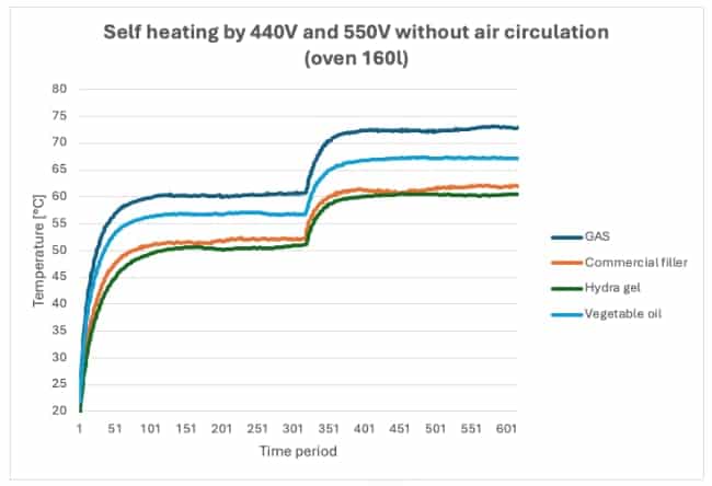 The heat conductivity of the new filler (cooling properties) can be verified at self-heating test of capacitor. The tested unit is put into the oven, and the temperature is controlled by thermocouples. Because nitrogen is a good thermal insulator, nitrogen-filled capacitors tend to run hotter internally, analogous to the insulating effect of air in a double-glazed window. In contrast, oil and gel fill the gap between winding and case with a thermally better medium, reducing the temperature rise at the dielectric hot spot. The test capacitors were filled by three different fillers: