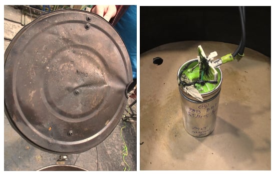 The destruction test was performed to compare the environmental pollution caused by the capacitor when exploded because handled incorrectly. The test samples of motor capacitor (S2) were manufactured without a safety disconnector so that differences in the behaviour of the filling during explosive disruption could be observed.