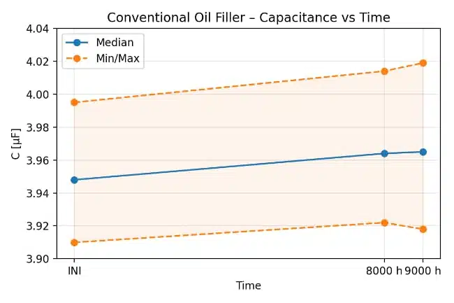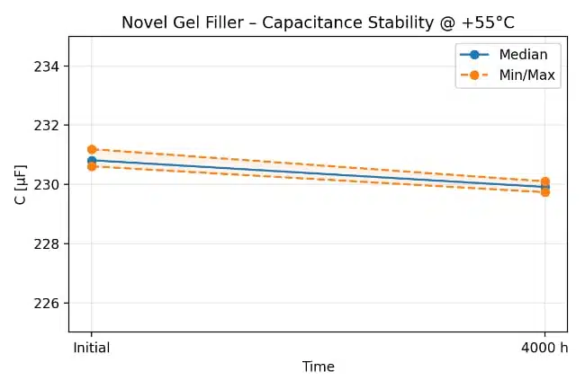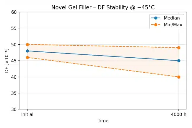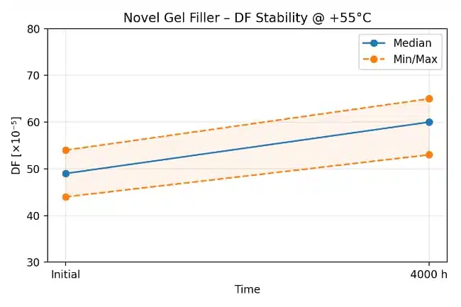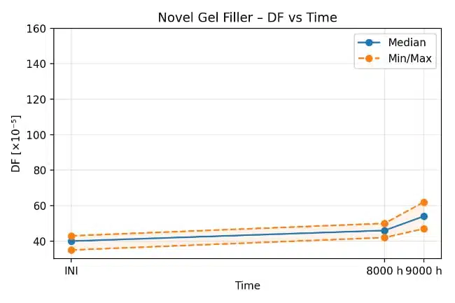 In long-term tests on Hydra power factor correction capacitors with gel filling, dissipation factor values after thousands of hours of accelerated life tests remain similar or lower than for comparable oil-filled units. This indicates stable dielectric behavior and good insulation properties over time under thermal and electrical stress, according to the manufacturer’s test data.