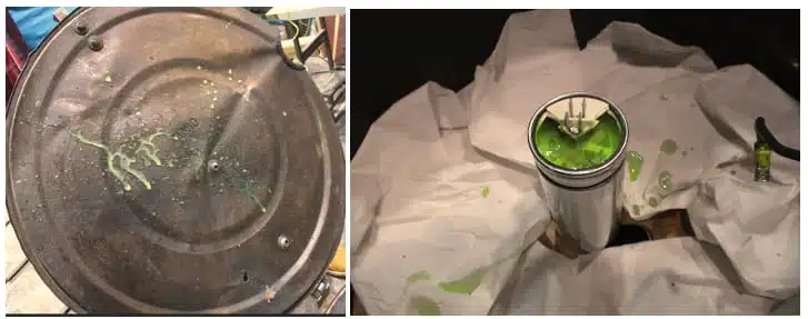 After the oil-filled test specimen exploded, numerous oil droplets were scattered throughout the test barrel (top image below). In contrast, the area around the gel-filled specimen remained clean (bottom image).