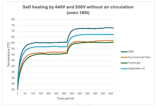 The heat conductivity of the new filler (cooling properties) can be verified at self-heating test of capacitor. The tested unit is put into the oven, and the temperature is controlled by thermocouples. Because nitrogen is a good thermal insulator, nitrogen-filled capacitors tend to run hotter internally, analogous to the insulating effect of air in a double-glazed window. In contrast, oil and gel fill the gap between winding and case with a thermally better medium, reducing the temperature rise at the dielectric hot spot. The test capacitors were filled by three different fillers:
