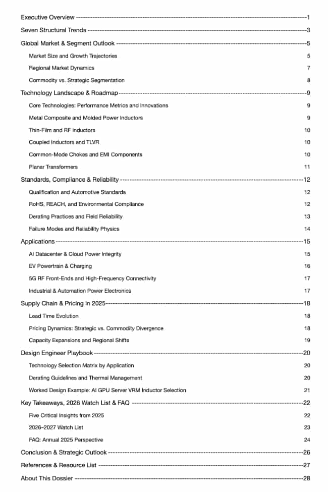 Unlike generic inductor reports that stop at high‑level market sizing, the 2026 Annual Inductor, Transformer & Magnetics Technology Dossier combines: