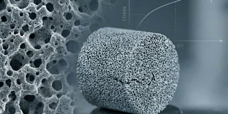 Measurement of yield strength (Ay) and strain hardening coefficient (K) on a limited statistical sample of sintered pellets is demonstrated to be a reliable virtual structural probe. These parameters provide direct insight into the internal stress state and surface morphology of the porous skeleton for an entire industrial batch before anodization. - Experimental baseline from bulk tantalum.