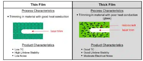 If we apply crystalline carbon on ceramic rods in a vacuum chamber or if we heat them up to temperatures close to 1000 ยฐC and then let them be hit by hydrocarbons, carbon will be deposited at a cracking process which will produce a stable, resistive carbon film with TCR values between โ€“250 and โ€“1000 ppm/ยฐC depending on the resistance value. The thickness typically varies between 0.04 and 40 ฮผm (1.6 and 1600 microinches). Low resistance values and corresponding thick films give an excellent pulse capability that may be further amplified if the film is non-spiraled.