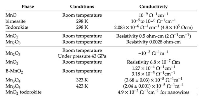 The electrical conductivity of manganese oxides is strongly linked to the oxidation state of manganese ions (Mnⁿ⁺) and their electronic structure, which affects electron hopping between different valence states (see Table 2).