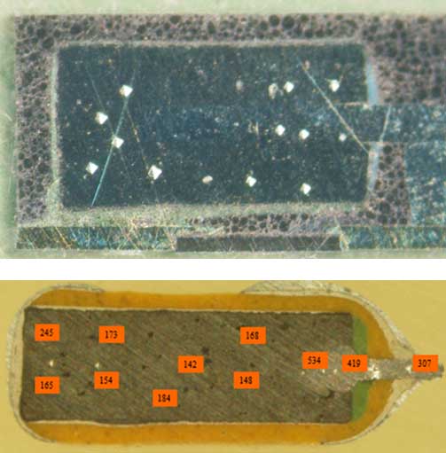 At the first stage, polished cross-sections of the finished capacitors were prepared (Figure 2), and MH measurements were taken, representing the combined contribution of the anode and the cathode layer of manganese oxide.