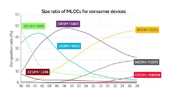 - Over time, industry trends show a demand for smaller MLCC sizes, with 0201 to 1206 being the most popular.