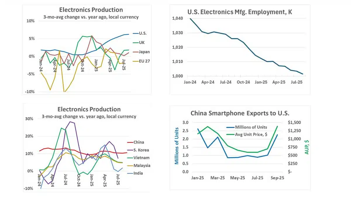The accelerating growth in U.S. electronics production can be partially attributed to the shift of manufacturing from other countries to the United States by both U.S. and foreign companies. This shift is primarily driven by the Trump administration’s tariffs, both implemented and threatened. However, this manufacturing shift has not resulted in increased employment in the electronics manufacturing sector. According to the U.S. Bureau of Labor Statistics, U.S. employment in electronics manufacturing has declined from 1.04 million jobs in January 2024 to 1.001 million jobs in August 2025. August is the latest available month due to the government shutdown. Over the past decade, employment in this sector has remained relatively stable, fluctuating between 1.001 million and 1.062 million jobs.