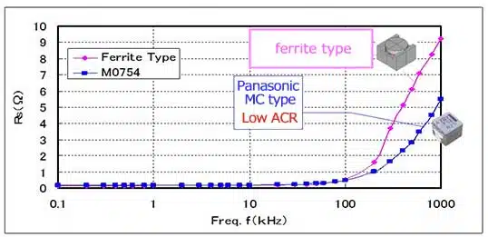 The graph below compares the AC resistance (ACR) of MC-type and ferrite-type inductors. As the frequency increases and ACR rises, AC losses increase, leading to higher heat generation. As indicated by the graph, the increase in ACR for the MC type is smaller than that for the ferrite type, indicating lower losses and heat generation even at high frequencies.