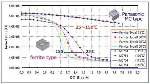 Generally, ferrite types are known for their pronounced saturation characteristics, as indicated by the graph, where inductance sharply decreases with increased DC bias and also varies with temperature. In contrast, Panasonic’s MC type does not exhibit a rapid decrease in inductance, indicating saturation, and shows minimal variation with temperature. This is a crucial point for power inductors, which are accompanied by heat generation.