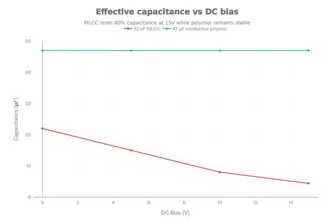 Switching to a single 47 µF conductive polymer capacitor eliminates this derating behavior, enabling a one‑to‑one capacitance design and significantly reducing component count and PCB area.