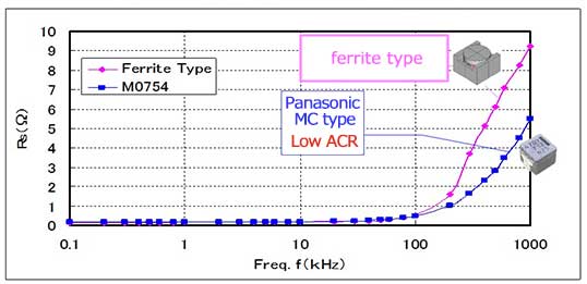 The graph below compares the AC resistance (ACR) of MC-type and ferrite-type inductors. As the frequency increases and ACR rises, AC losses increase, leading to higher heat generation. As indicated by the graph, the increase in ACR for the MC type is smaller than that for the ferrite type, indicating lower losses and heat generation even at high frequencies.