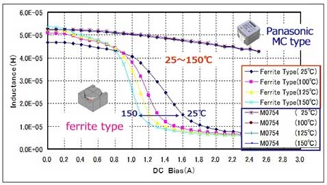Generally, ferrite types are known for their pronounced saturation characteristics, as indicated by the graph, where inductance sharply decreases with increased DC bias and also varies with temperature. In contrast, Panasonic’s MC type does not exhibit a rapid decrease in inductance, indicating saturation, and shows minimal variation with temperature. This is a crucial point for power inductors, which are accompanied by heat generation.