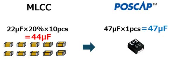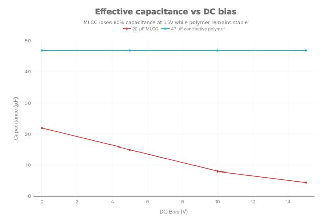 Switching to a single 47 µF conductive polymer capacitor eliminates this derating behavior, enabling a one‑to‑one capacitance design and significantly reducing component count and PCB area.