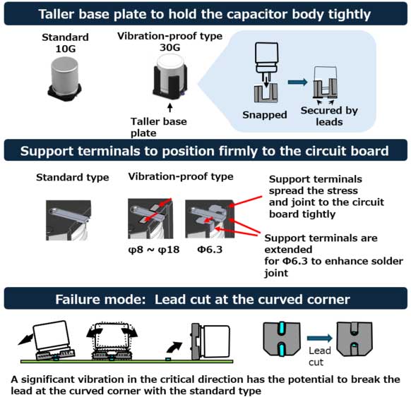 - For embedded drive electronics inside robot joints, consider vibration‑resistant hybrid aluminum electrolytic capacitors where board‑level reinforcement would otherwise be needed. This can reduce manufacturing steps such as adhesive application and manual inspection, especially under 30G‑class vibration conditions described in the press information.