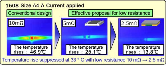 For current detection, Panasonic offers chip resistors with very low resistance values, enabling reduced power loss in shunt applications. An illustrative example shows that when 4 A flows through a 10 mΩ shunt resistor, the associated heat rise is significantly higher than through a 2.5 mΩ shunt; lowering the resistance can reduce the temperature by about 33 °C in the given scenario. Engineering measures contributing to these low values include forming resistive elements on both sides of the substrate and using a long‑side electrode layout, as well as shifting from AgPd to CuNi alloy resistive materials with lower resistivity.