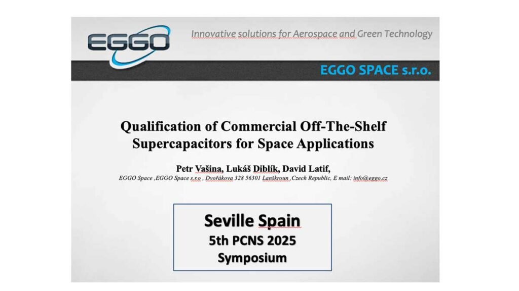 The paper “Qualification of Commercial Off-The-Shelf Supercapacitors for Space Applications” was presented by David Latif, EGGO Space s.r.o , Lanskroun, Czech Republic at the 5th PCNS Passive Components Networking Symposium 9-12th September 2025, Seville, Spain as paper No. 6.1.