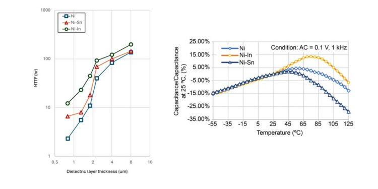 As a result, Ni–In MLCCs exhibit higher MTTF and dielectric constants while maintaining appropriate temperature characteristics, and their reliability improvement continues as the dielectric layer becomes thicker. The authors suggest that further optimization of In content, BaTiO3 grain size and shell continuity could yield even more reliable Ni–In MLCCs for demanding automotive and AI‑related applications.
