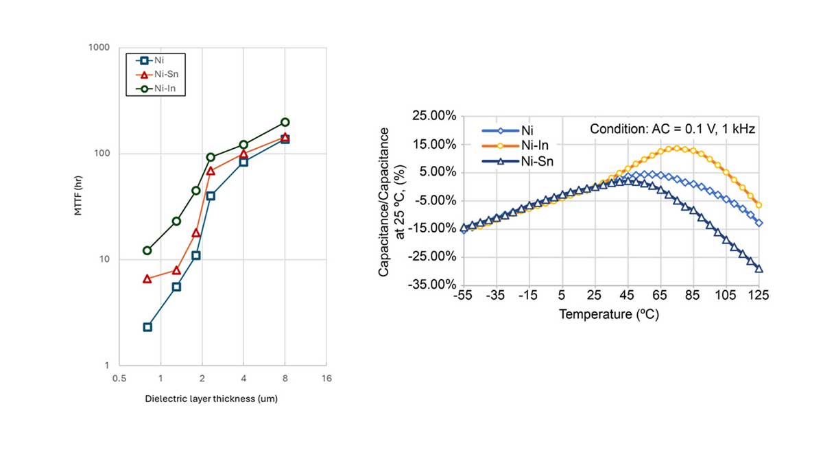 - Ni–In electrodes provide the strongest improvement in mean time to failure (MTTF) as dielectric thickness increases, outperforming pure Ni and Ni–Sn.