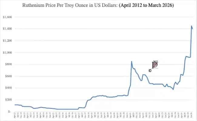 Figure 1. Ruthenium Price per Troy Ounce in US Dollars by Month, April 2012 to March 2026, Source: Paumanok Publications, Inc.
