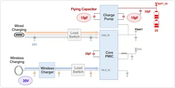 In parallel, battery charging systems inside smartphones increasingly use high-voltage, low-current topologies or switched-capacitor charge pumps instead of purely low-voltage, high-current schemes. In such architectures, 35 V rated MLCCs on the input and intermediate nodes are expected to become the standard even for mid-range devices, not only for flagship phones.