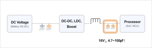 - The 22 µF, 6.3 V option is a candidate for rails where higher voltage margin is required, for example 3.3 V lines or boosted supply nodes inside camera or radar modules.