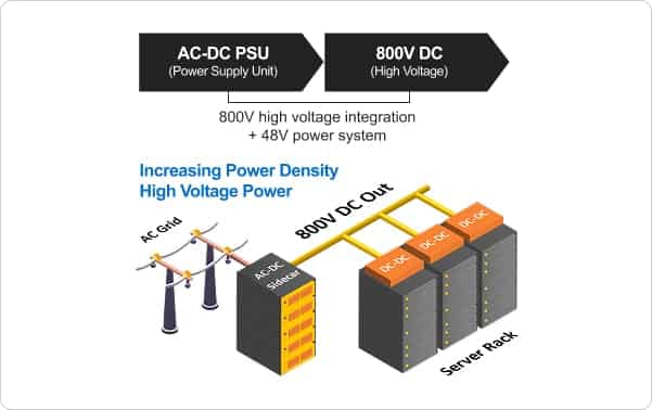 For the power segment, Samsung’s strategy follows the shift from legacy 12/48 V conversion schemes to architectures that rectify mains AC to an 800 V DC bus and then convert down inside the rack. As rack power climbs towards the 120 kW class, both efficiency and reliability become critical.