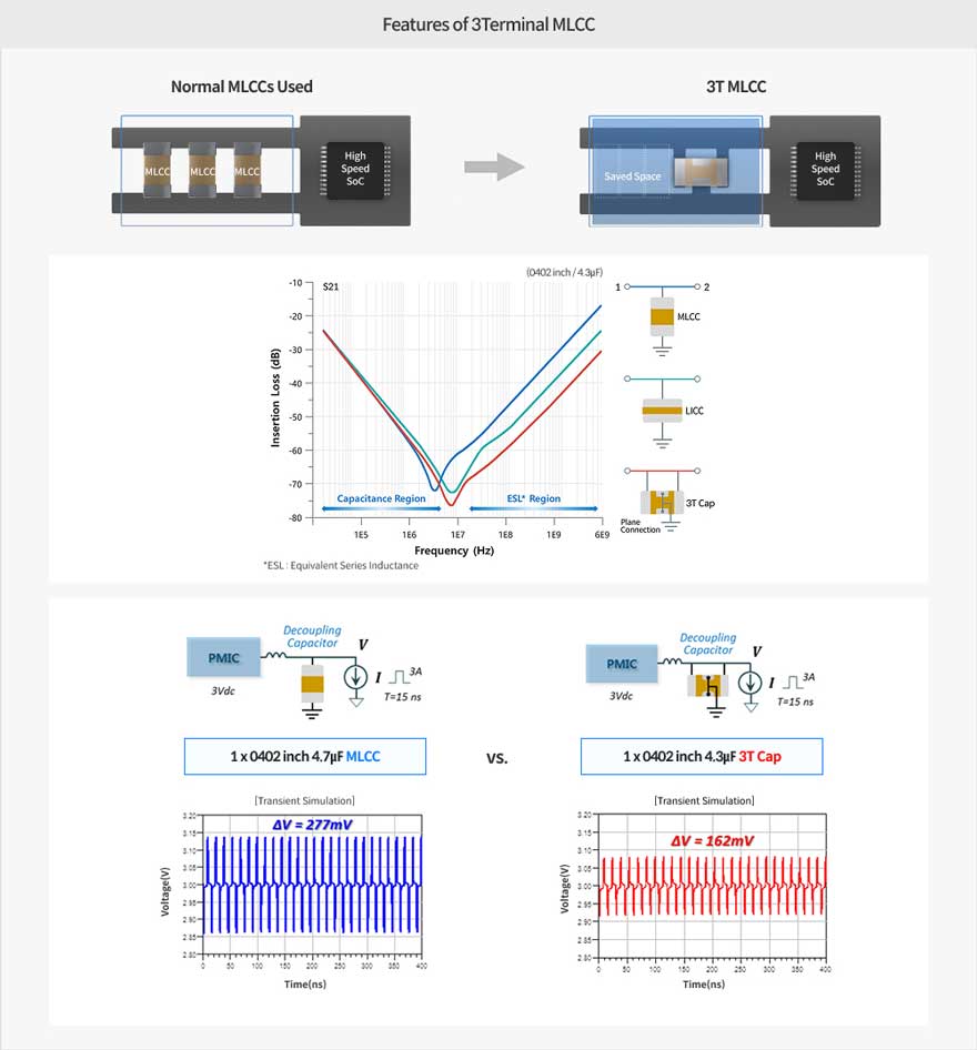Low ESL(3T) MLCCs excel at mitigating high-frequency noise, enabling stable power supply with fewer devices compared to normal MLCCs. This makes them an excellent solution in circuits with limited board space.